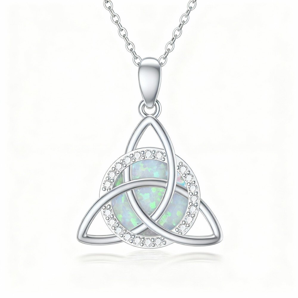 Discover the elegance of our exquisite 10K White Gold Pendant Necklace, featuring a stunning Opal centerpiece and sparkling Cubic Zirconia, all beautifully designed with a Celtic Knot motif.