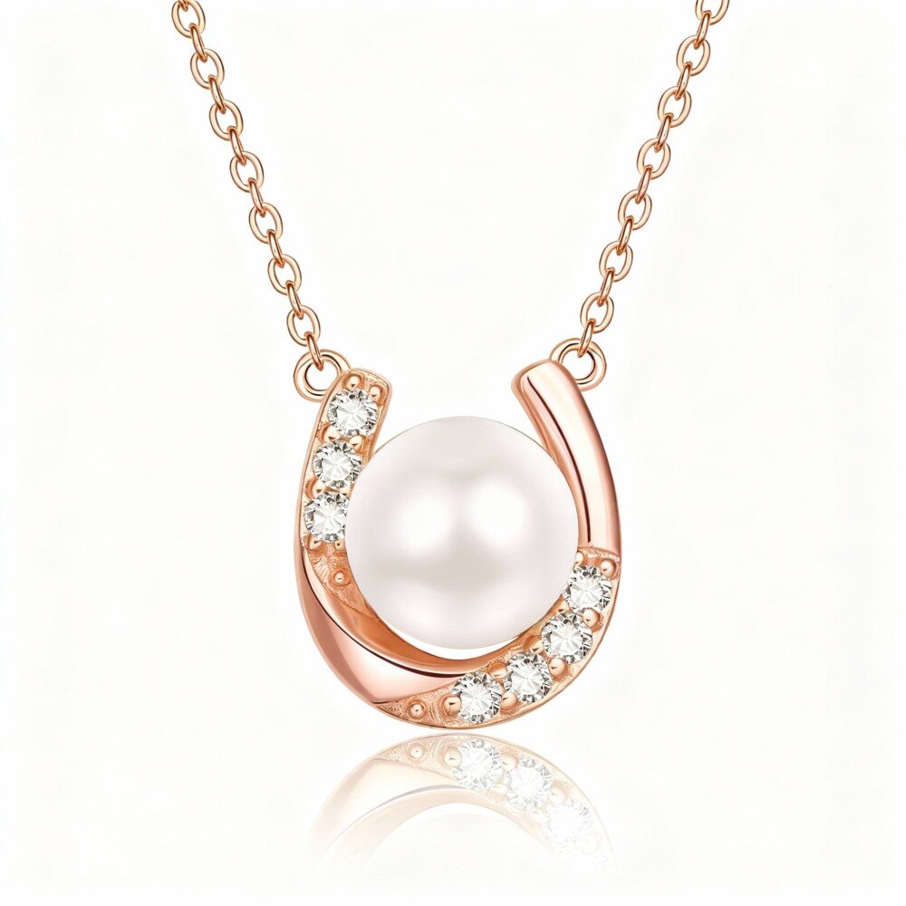 This exquisite necklace features high-quality 10K Rose Gold, ensuring durability and a luxurious shine, while the clear, white Cubic Zirconia stones and pearls add a touch of sparkle and sophistication. The unique horseshoe pendant symbolizes good luck, making it not only a fashionable accessory but also a meaningful gift. Whether for everyday elegance or special occasions, this necklace is designed to enhance any outfit and make a lasting impression.