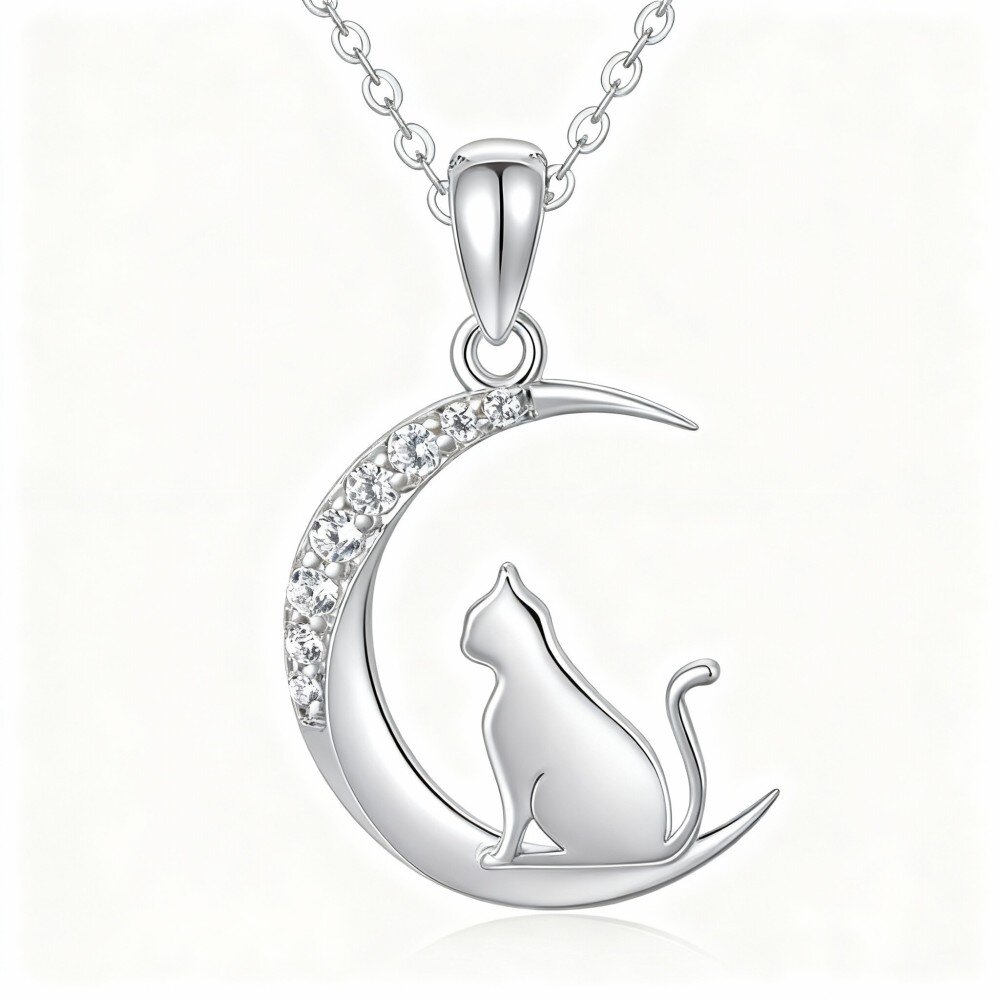 Discover our stunning 10K White Gold Pendant necklace featuring a unique Cat and moon design, embellished with dazzling Cubic zirconia for a touch of elegance.