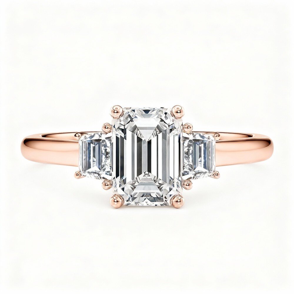 Crafted from high-quality 10K Gold, this engagement ring highlights the brilliance of ethically-sourced Moissanite, known for its fire and sparkle that rivals even the finest diamonds. The three-stone design not only amplifies elegance but also represents the journey of love—past, present, and future. With a total weight of 2 CT.T.W., this ring boasts a perfect blend of sophistication and durability, ensuring it remains a cherished symbol of your love for years to come, while the exquisite Rose Gold enhances the allure of the stones.