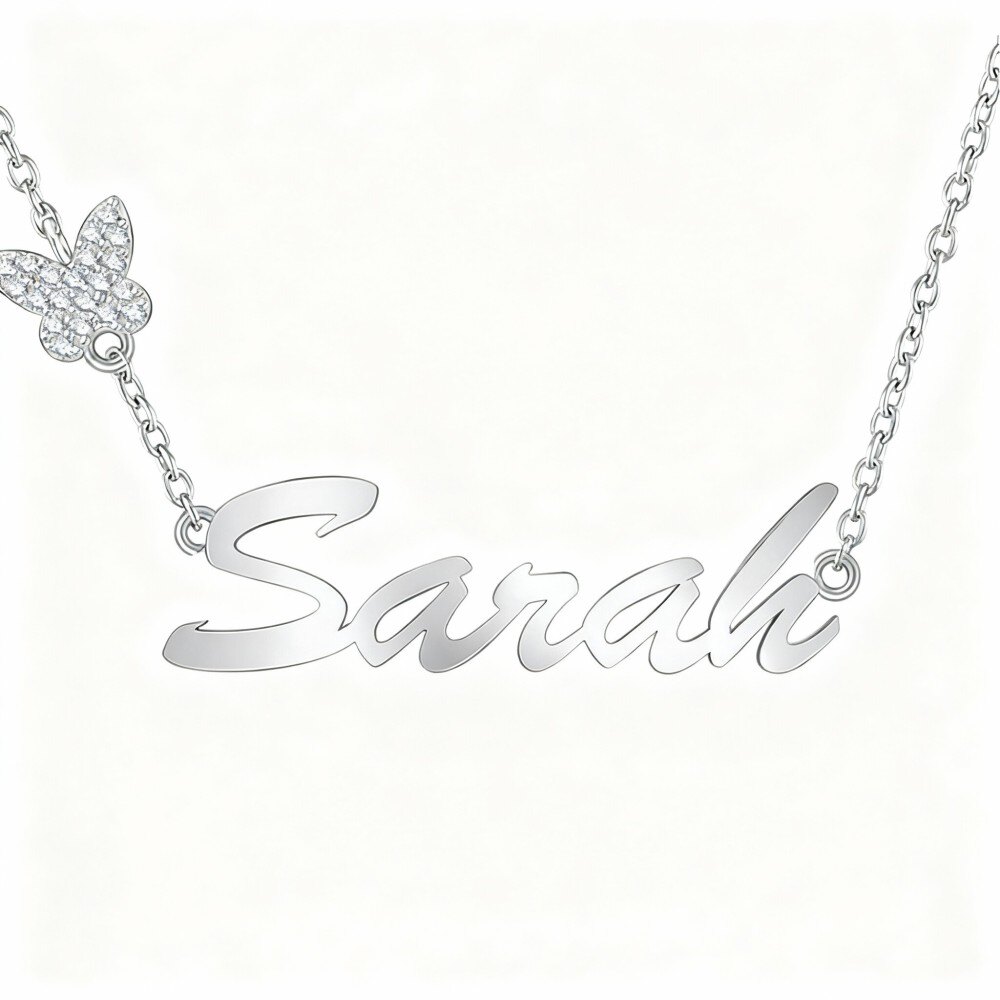 PERSONALIZED BUTTERFLY NAMEPLATE NECKLACE:The butterfly is a symbol of transformation, hope, and courage. You can personalize the pendant with any text you like, including names, special dates, numbers, letters, or words. This necklace makes a distinctive gift, perfect for yourself or someone special.