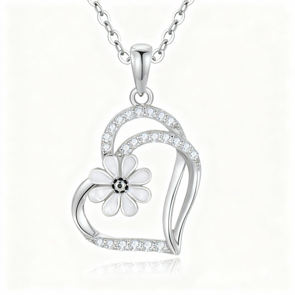 Experience the allure of our 10K White Gold Necklace, featuring a unique heart design embellished with sparkling Cubic Zirconia and a charming daisy motif.
