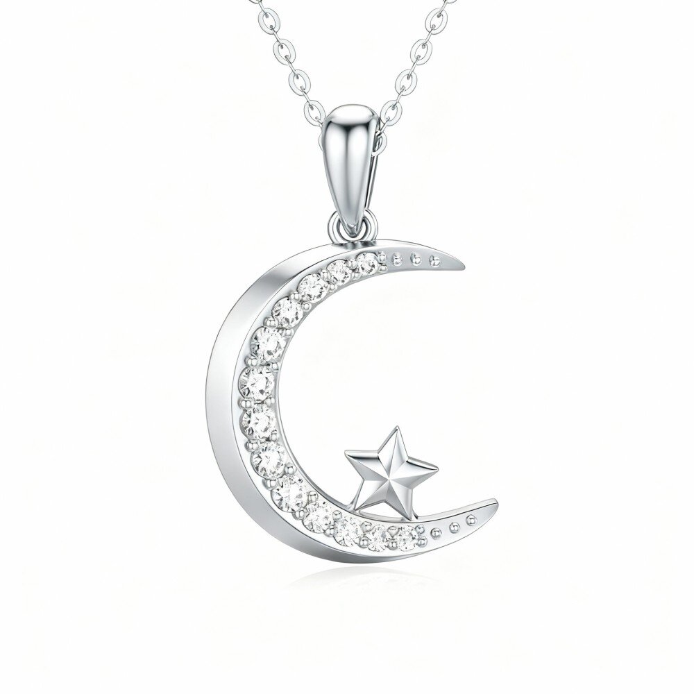 Enhance your elegance with our beautiful 10K White Gold Pendant Necklace featuring a Moon and Star design adorned with sparkling Cubic Zirconia.