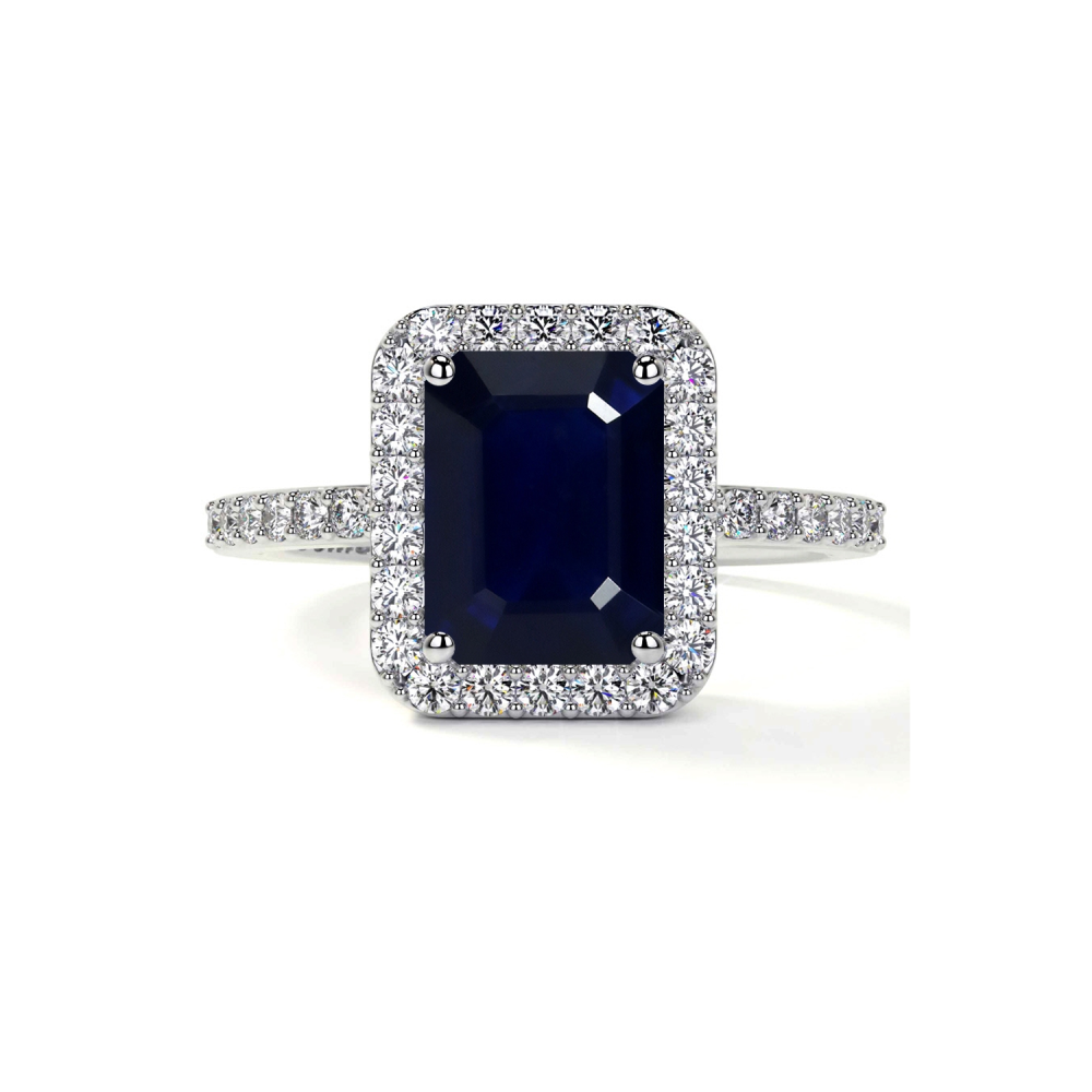 Crafted in high-quality 10K White Gold, this engagement ring combines durability with an elegant finish, ensuring it will withstand the test of time. The centerpiece is a magnificent sapphire, renowned for its deep, rich hue and symbolic meaning, representing wisdom and nobility. Surrounding the center stone, the halo of dazzling moissanite side stones enhances its beauty, adding extra sparkle and brilliance. Perfectly customizable, this ring allows you to create a personalized piece that truly embodies her style, making it an ideal choice for that unforgettable moment.
