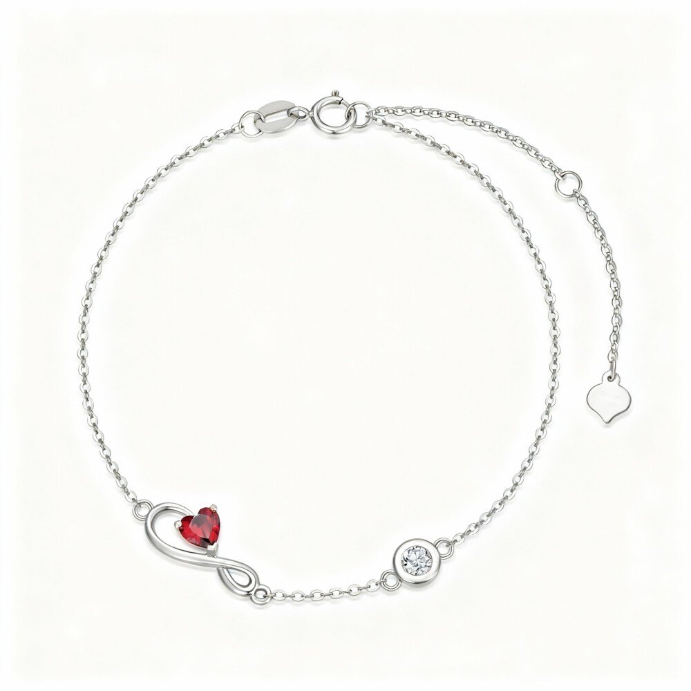 This exquisite bracelet showcases a beautifully designed heart-shaped Charm and a graceful infinity symbol, crafted with precision in 10K White Gold to provide lasting brilliance and durability. Each bracelet is embellished with sparkling Cubic Zirconia stones that reflect light beautifully, creating a captivating effect with every movement. The centerpiece, a rich red Garnet, introduces an element of luxury and passion, making this piece not just an accessory, but a statement of style and sophistication. Perfect for special occasions or as a thoughtful gift, this bracelet is a timeless addition to any jewelry collection, embodying grace and elegance that women cherish.