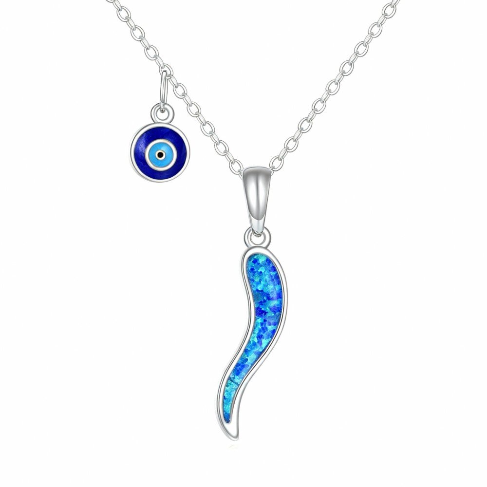 This exquisite necklace is designed with a captivating opal at its center, embodying the protective qualities of the evil eye and the charm of the Italian horn. Perfectly curated for women who value both elegance and uniqueness, this 10K White Gold piece serves not just as a fashionable accessory but also holds deep cultural significance. It is an ideal gift for yourself or a beloved one, intertwining beauty with tradition. Each necklace is crafted with precision and care, ensuring that you receive a piece that not only shines but tells a story of protection and luck. Wear it as a symbol of strength and elegance, or gift it to someone special as a reminder of cherished connections and shared traditions.