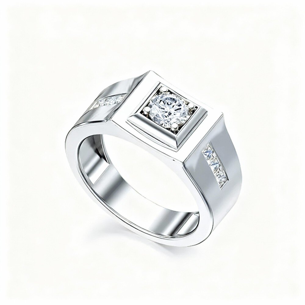 Discover our stunning men's ring crafted from 10K White Gold, featuring a captivating princess-square shaped Moissanite that can be personalized with an engraving, blending luxury and individuality seamlessly.