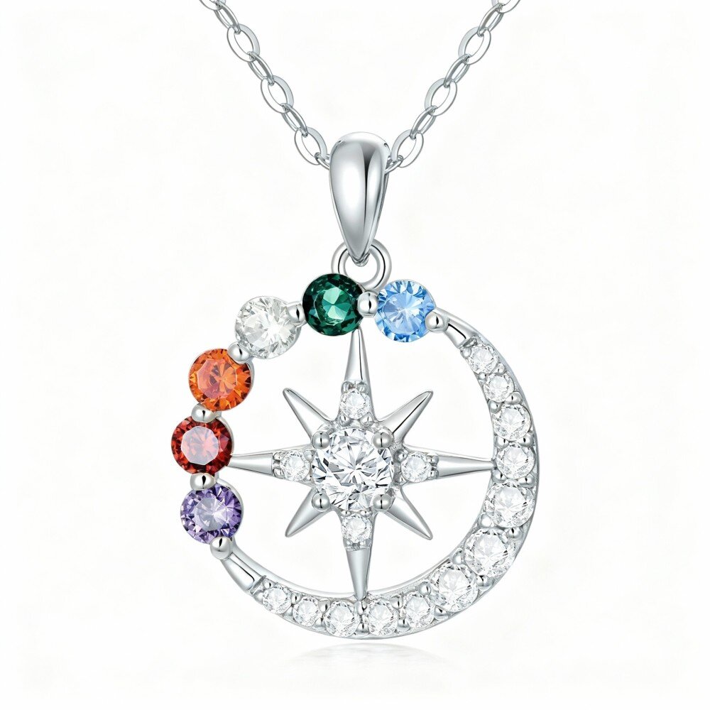 Discover the exquisite charm of our 10K White Gold Pendant Necklace adorned with vibrant Zircon gemstones representing Chakras and celestial bodies.