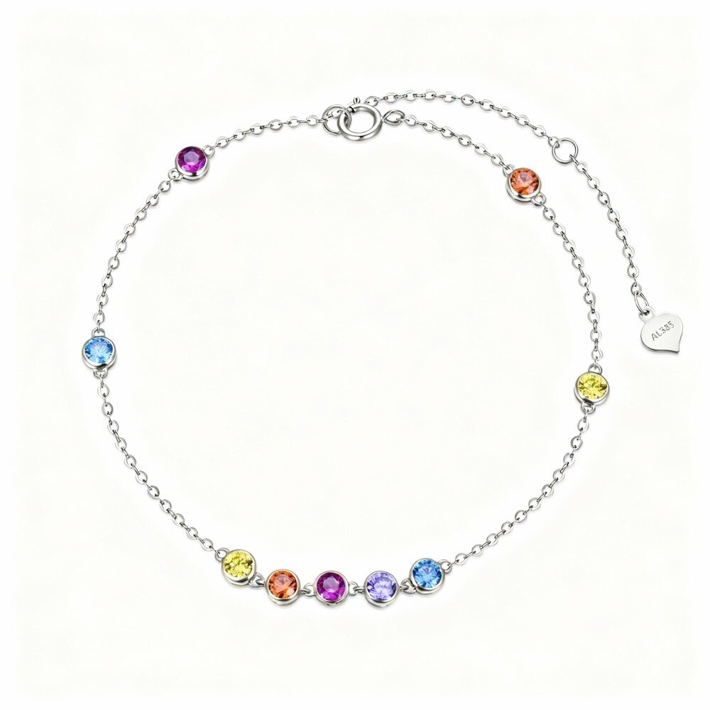 Discover the elegance of our 10K White Gold Circular Charm Anklet, designed with vibrant Cubic Zirconia charms symbolizing spiritual balance.
