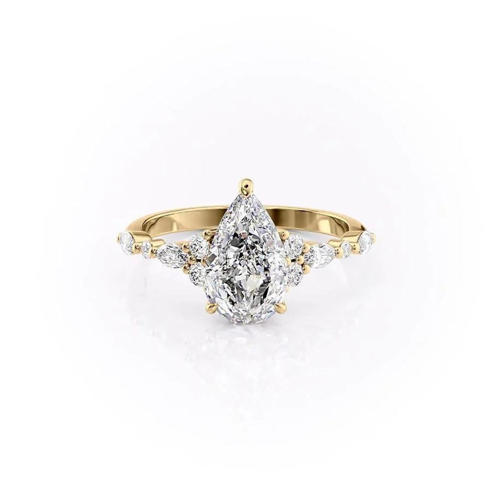 Dimension:Available in metal types: 10K, 14K, 18K Gold, or 925 Sterling Silver, Ring sizes range from 4 to 13. The main stone is Moissanite, available in Pear. Center stone weights are 2 carats. Engagement ring side stones also feature Moissanite. Packaged in a gift box.
