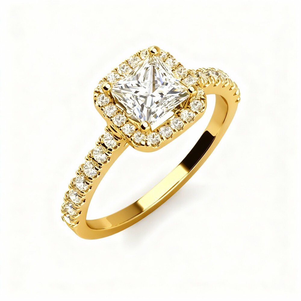 Discover the epitome of luxury and love with our stunning 14K Gold Engagement Ring, which features a dazzling princess-square shaped Moissanite, offering the perfect blend of brilliance and clarity. This exquisite piece for women is further personalized with custom engraving and available in elegant Gold.