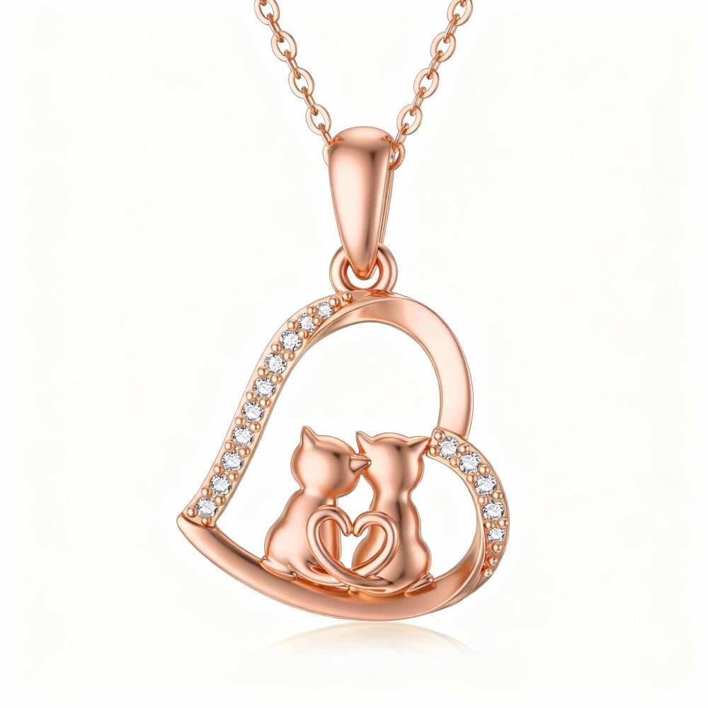 **Details**: Crafted from premium 14K Rose Gold, this stunning pendant necklace showcases a meticulously designed cat and heart motif, embellished with brilliant Cubic Zirconia stones that sparkle like real diamonds. This unique piece is an ideal gift for women, combining luxurious Rose Gold, a touch of playful elegance, and heartwarming symbolism to create an unforgettable accessory for any occasion.