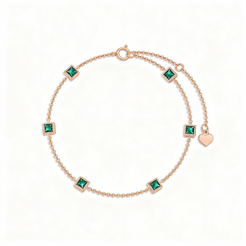 Embrace elegance with our exquisite 14K Rose Gold Charm Bracelet, designed with a stunning princess-square shaped emerald that radiates sophistication and timeless charm, perfect for any woman who appreciates the finer things in life.