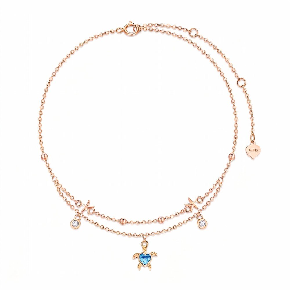 This exquisite anklet showcases a beautiful design with charming ocean-inspired motifs, including a sea turtle and a starfish embellished with dazzling zircon stones. Crafted from premium 18K Rose Gold, it not only promises durability but also radiates a luxurious glow that enhances any skin tone. The multi-layered structure adds an artistic depth, making it an ideal piece for layering or wearing alone as a statement accessory. The shimmering zircon gemstones that adorn the sea turtle and starfish charms introduce a playful yet refined touch to your jewelry collection, making it an exceptional gift for both ocean enthusiasts and fashion aficionados. Enjoy a comfortable fit and timeless appeal with our stunning anklet, designed to infuse your everyday attire with a delightful hint of beach charm.