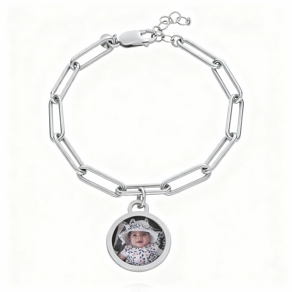 Crafted from premium 9K White Gold, this exquisite bracelet features a unique Charm that can be personalized with your favorite photo, creating a timeless piece that holds special meaning. Unlike most jewelry, it boasts a sleek design without stones, ensuring a versatile and classic look that complements any outfit while keeping your cherished memories close.