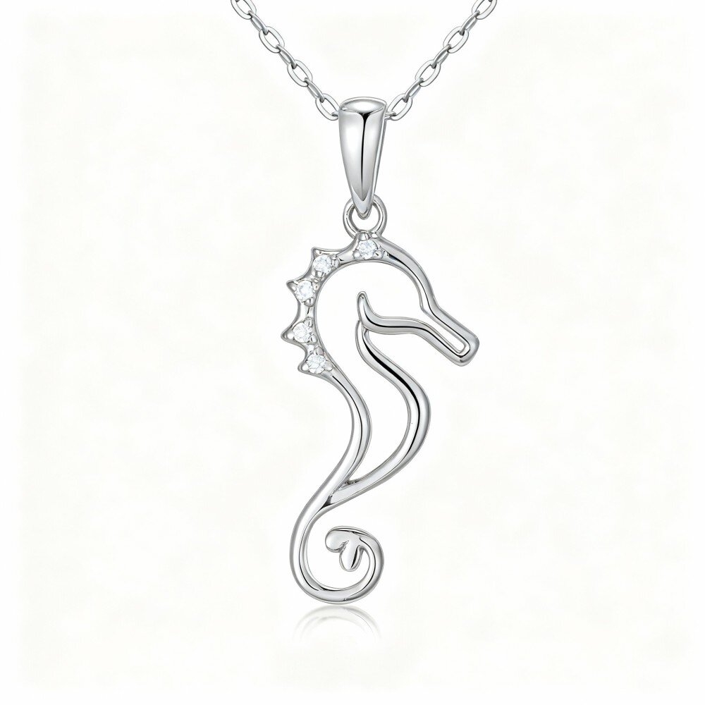 Discover the elegance of our stunning 9K White Gold Pendant Necklace, featuring a round Moissanite gemstone and a beautifully crafted seahorse design, perfect for women who appreciate exquisite and unique jewelry pieces.