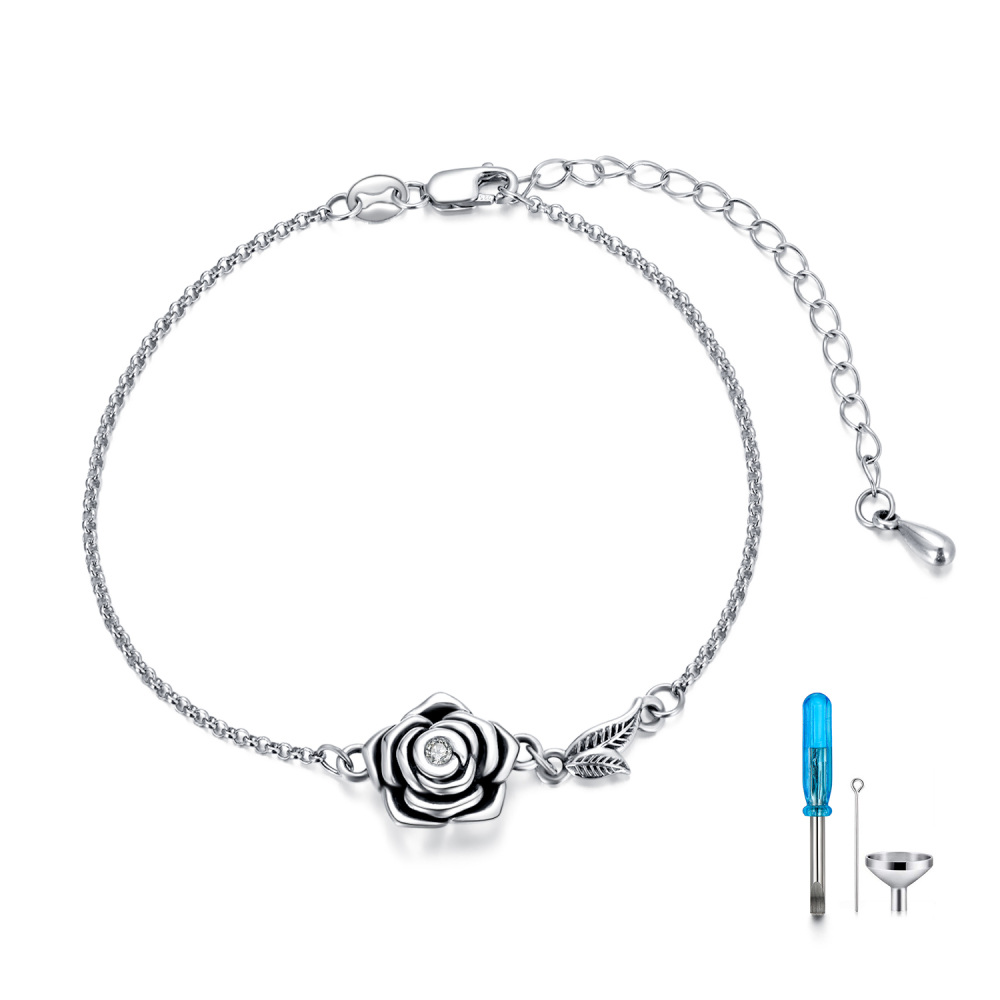 Discover elegance and sentimental value with our stunning Sterling silver urn bracelet for ashes, featuring a circular-shaped design adorned with crystals and an intricate rose pattern, perfect for women who appreciate retro silver styles.