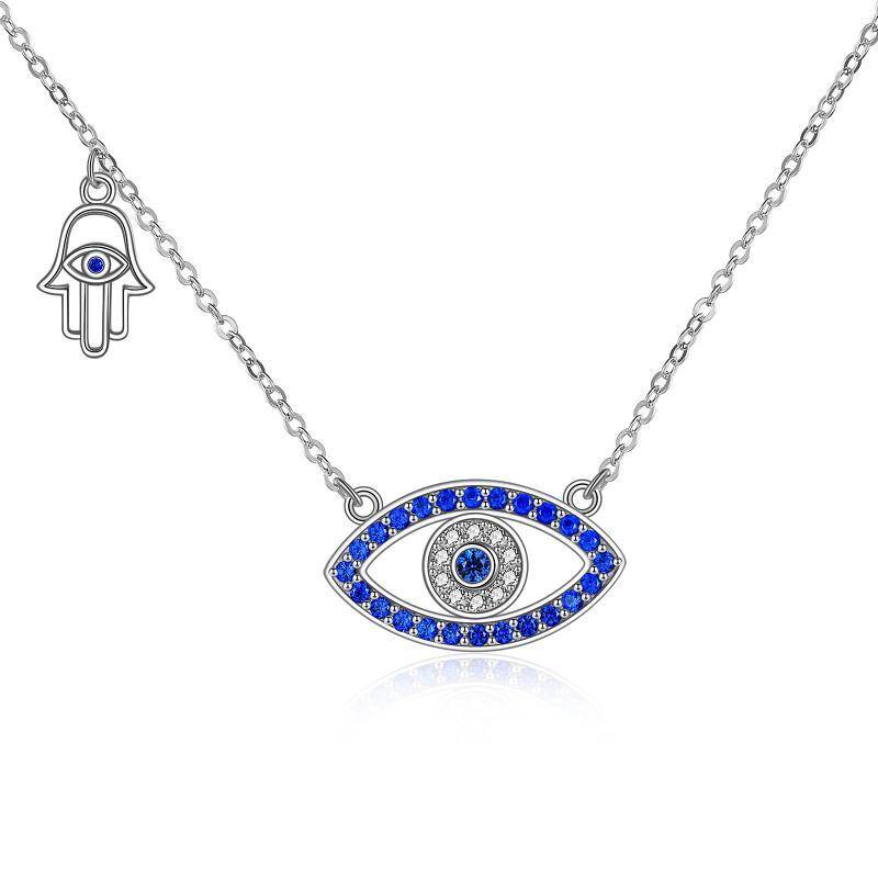 This exquisite piece combines the durability of sterling silver with a luxurious white gold finish, making it an ideal accessory for any occasion. The pendant's intricate circular shape housing blue and white cubic zirconia stones creates a gleaming Evil Eye and Hamsa Hand, perfect for adding a touch of elegance while channeling positive vibes and safeguarding your spirit.