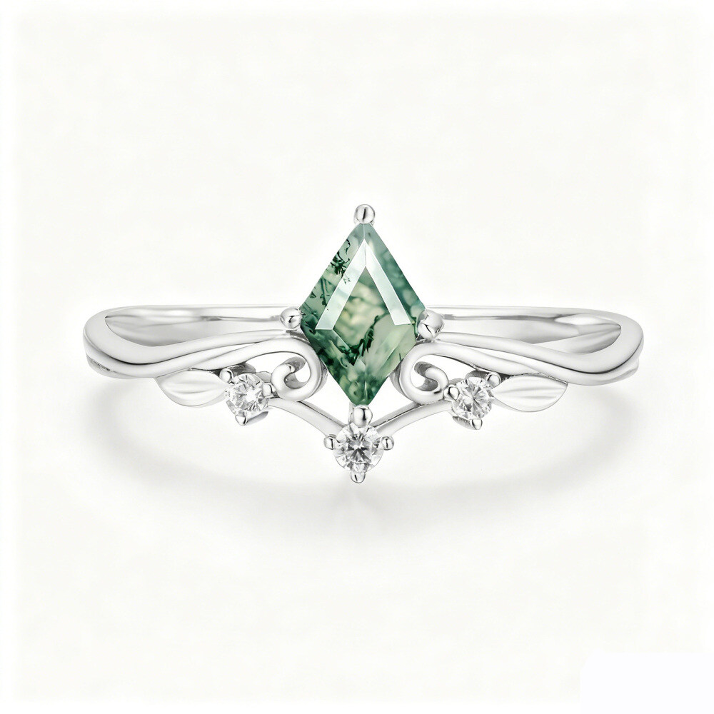 This stunning engagement ring features a captivating Moss Agate centerpiece, renowned for its unique, naturally-formed patterns, set within a band made of Sterling Silver for unparalleled durability and luster. The entire piece is meticulously plated in White Gold, adding an extra layer of sophistication and shine, ensuring that this ring not only symbolizes your love but also stands the test of time with its exquisite craftsmanship. Perfect for nature-loving brides who desire both beauty and quality in one exceptional piece.