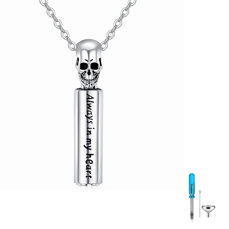 Each necklace in our collection is crafted from premium sterling silver and plated in elegant white gold, ensuring a lasting and tarnish-resistant finish. These special urn necklaces serve as a beautiful memorial, allowing you to keep ashes of loved ones securely. With distinctive designs like skulls and other creatively crafted shapes, these pieces stand out not only for their aesthetic appeal but also for their deeply personal significance, making them cherished keepsakes that women can carry close to their hearts with the heartfelt inscription "Always In My Heart."